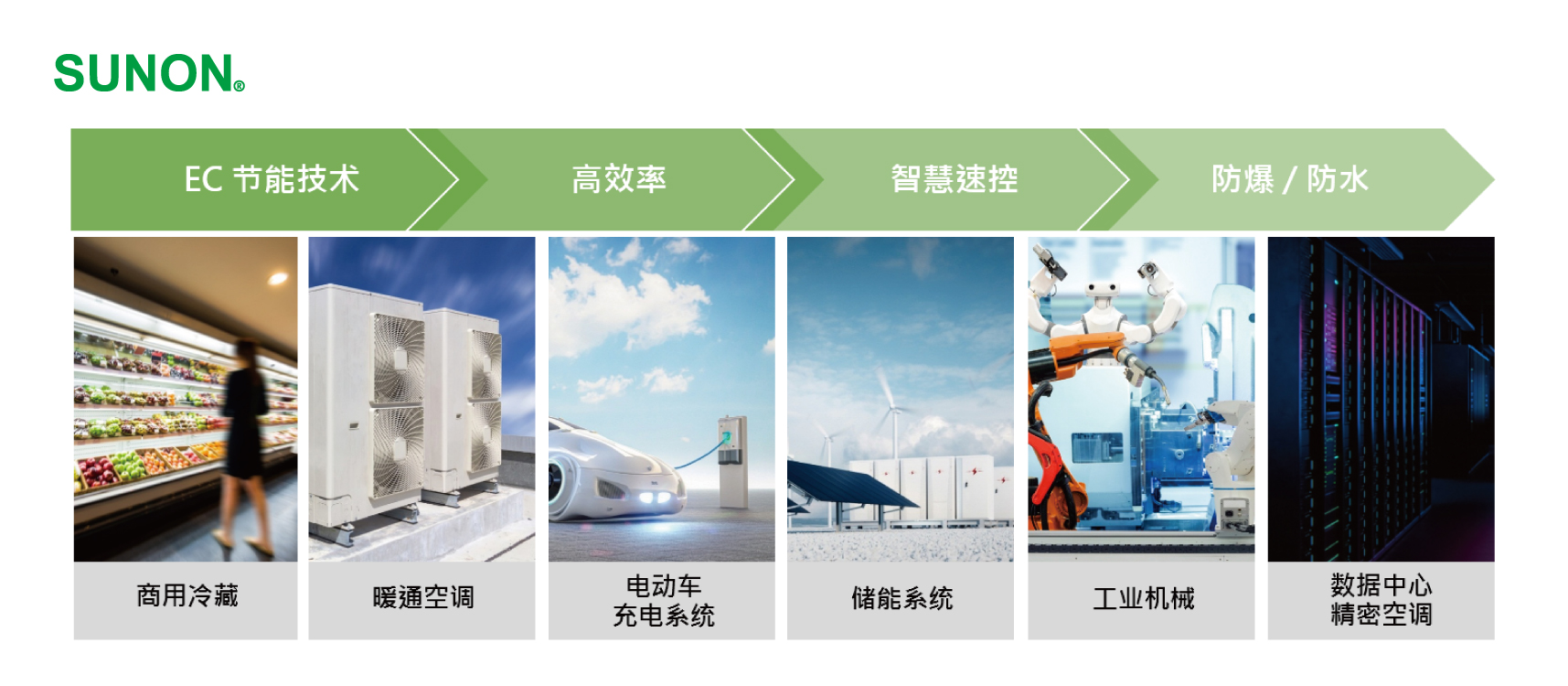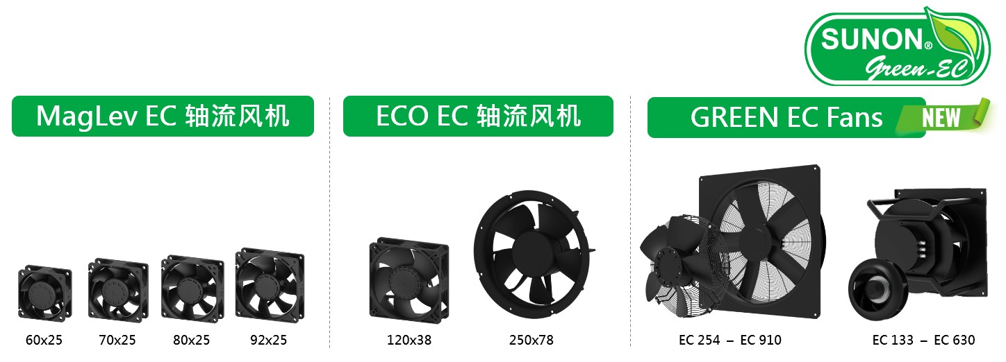 SUNON高效節能EC風扇將DC風扇直流馬達及轉速控制功能,直接應用于交流電源輸入環境,并擁有節能與智慧控制等優勢,SUNON高效節能EC風扇依據不同產業應用共分為三大系列,小型的MagLev EC、Eco EC 系列,與大型的Green EC 系列。