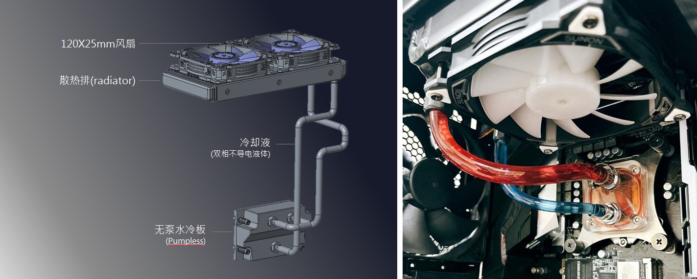 工作站強(qiáng)大的運(yùn)算能力,仰賴高性能多核心的CPU、GPU處理能力,要維持全年無休的高效運(yùn)作則仰賴高可靠度的散熱系統(tǒng);建準(zhǔn)自驅(qū)式相變液冷技術(shù)可以幫助工作站維持良好的工作溫度,且長效、高可靠度的散熱設(shè)計(jì),能降低工作站液冷散熱系統(tǒng)漏水、當(dāng)機(jī)甚至損壞系統(tǒng)的風(fēng)險(xiǎn)。建準(zhǔn)自驅(qū)式相變液冷技術(shù)藉助流體相變化的壓力與密度差異產(chǎn)生對(duì)流,將CPU、GPU、DCU產(chǎn)生的熱垂直輸送到散熱排(radiator),再搭配高效散熱風(fēng)扇將高溫液體降溫并將已汽化的蒸汽凝結(jié)成液態(tài)后送回原處,形成一個(gè)快速的散熱循環(huán);透過雙相不導(dǎo)電液體的汽化與凝結(jié)過程就足以維持液體的流動(dòng)形成循環(huán)散熱,無需泵浦,除提高系統(tǒng)的可靠度,更具有降低成本、降低噪音、降低震動(dòng)、降低故障與更容易維護(hù)的優(yōu)勢(shì);另在冷卻介質(zhì)的選用,建準(zhǔn)更是重視良好的物質(zhì)兼容性避免設(shè)備故障,不導(dǎo)電、不可燃,更不會(huì)破壞臭氧層,全球暖化潛值低(Low GWP)。以一個(gè)工作站中需要快速解熱的顯示芯片(GPU, TDP 450W)應(yīng)用為例,僅需240mm散熱排(radiator)搭配2顆120X25mm風(fēng)扇的自驅(qū)式相變液冷散熱器內(nèi)含環(huán)保安全的冷卻液(GWP =2)即可以維持工作站長時(shí)間不降頻的高效穩(wěn)定運(yùn)轉(zhuǎn)。