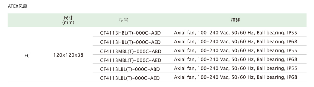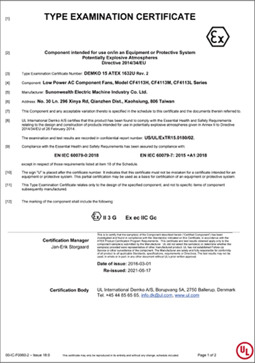 SUNON防爆AC和EC風扇已取得歐盟ATEX防氣爆認證,亦提供客制化ATEX粉塵爆防護設計服務,能在具潛在爆炸風險的應用環境范圍內,直接對電氣設備的使用提供適當有效的安全裝置保護力。 環境永續意識抬頭,傳統冷藏設備使用的HCFC系列冷媒中的氟氯碳化物會破壞臭氧層,已遭各國禁用或減量使用。新世代冷藏設備陸續轉型,無氟的環保冷媒逐漸取代傳統冷媒,由于環保冷媒多為碳氫鹵化物,在常溫常壓下性質穩定不易起火燃燒,但在不同的環境條件下仍具有爆炸的危險性,SUNON的防爆風扇可符合新世代的冷藏系統的使用安全需求。 同時,散熱風扇具備防爆安全性是國際市場的必要條件,SUNON防爆風扇具備無火花防護性*,可應用在具潛在爆炸風險的應用環境如儲能和能源轉換設備系統,當能源系統異常時,可避免造成相關能源系統的損壞或引爆疑慮。另外,SUNON散熱風扇應用在各式工業制造產業內的多數電氣儀器和設備如金屬切割廠等制程,都有可燃粉塵爆炸性的危險,SUNON提供客制化ATEX粉塵爆防護設計服務,保障客戶終端產品的運作質量及使用上安全無虞。