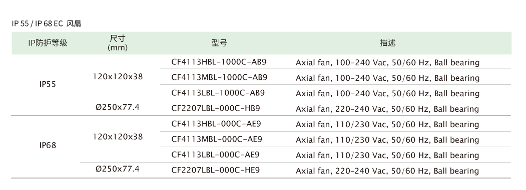 SUNON 交流風扇系列具有風量穩定和長效散熱的特性,從60mm~250mm風扇產品廣泛應用于工業設備、商業設備、冷凍冷藏、醫療設備等。近年來在節能產品發展趨勢下,也發展一系列ECO-EC風扇,采用高效馬達搭配各種控制功能,以達到降低能源消耗的設計需求。并可依客戶系統使用于各種嚴苛環境,提供各種防護等級IP21~IP68防水防塵與ATEX 防爆防護。我們不僅提供專業的產品服務以保障產品長效使用、安全可靠性,同時提供高質量和高效率的最適化交流風扇解決方案以滿足各產業的散熱需求。